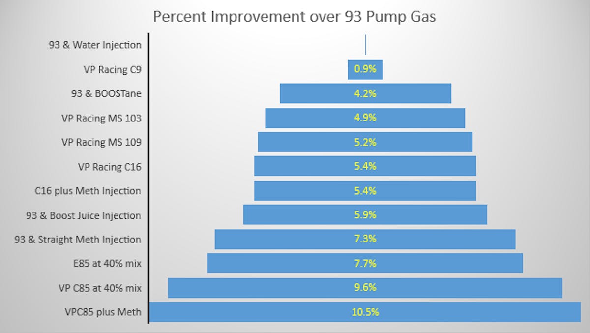 Here’s our final results chart, with all fuels, octane enhancers and injections we tested: