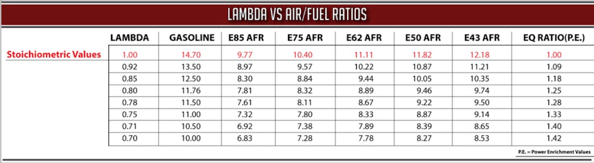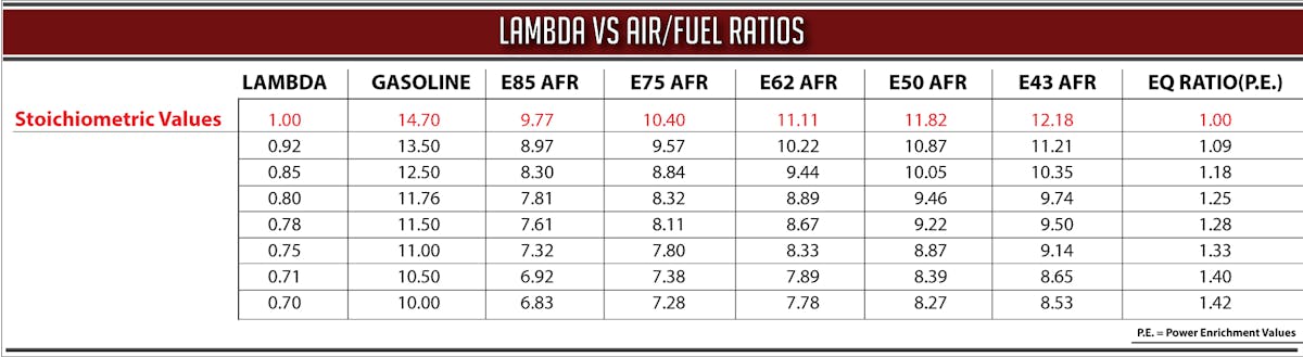 The ethanol-based fuels are also best tuned using Lambda method instead of air/fuel ratio due to changing stoichiometric ratios from the changes in fuel quality. For example, filling up with “E85” that turned out to be only 43-percent ethanol, would have a stoichiometric value of 12.18:1, but E85 has a stoichiometric value of 9.77:1. Due to the fact that these are constantly changing from fill up to fill up, it’s easier to tune using Lamba—because Lambda never changes. If you aren’t familiar with how this works, have a look at the table below, taken from The Tuning School’s GM Advanced Level 2 course.