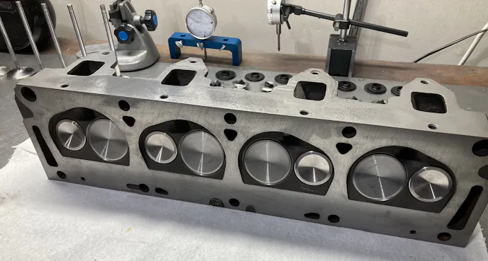 For the heads, Brent milled the deck surfaces of the stock pieces down to where the thumbprints were essentially gone, which awarded him with a 62cc chamber. The valve job was followed up with assembly using PAC small-diameter valvesprings, Manley titanium retainers, Victory radiused valve locks, and Viton valve seals.