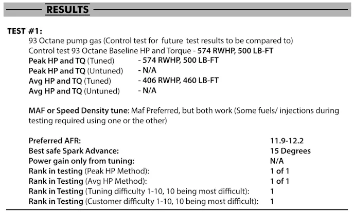 This was our baseline test, used to establish a control against which all the other fuels, additives and injections were measured. In the upcoming tests, we’re going to see how each of the other fuels, additives and injections measure up when you don’t retune for them by using this as a baseline comparison.