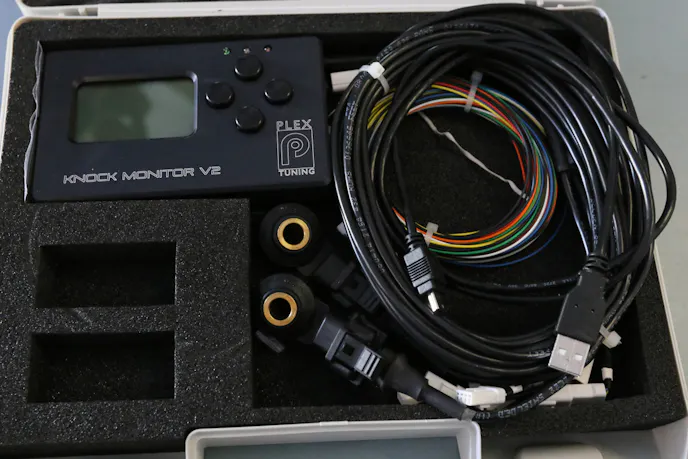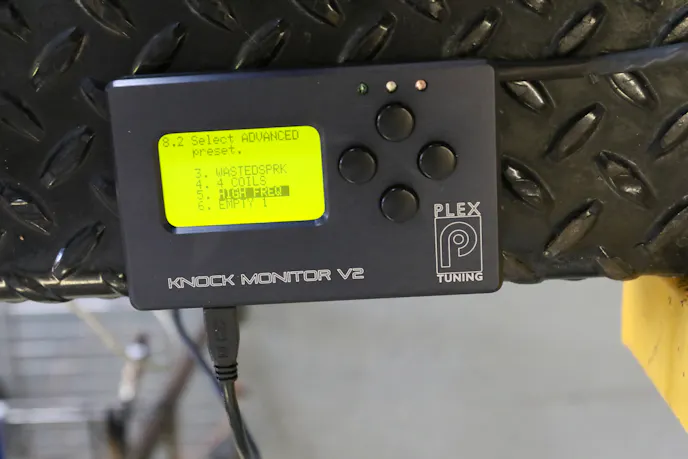 Tuning on pump gas, 93 octane resulted in a maximum safe spark advance of 15 degrees. We measured this with our Plex Knock Monitor as a known method to prove when we encountered real knock. We added spark advance 2 degrees at a time until stopping at 15, because knock occurred at 16 degrees, although considerably more power could have been made if we risked keeping the extra spark advance.