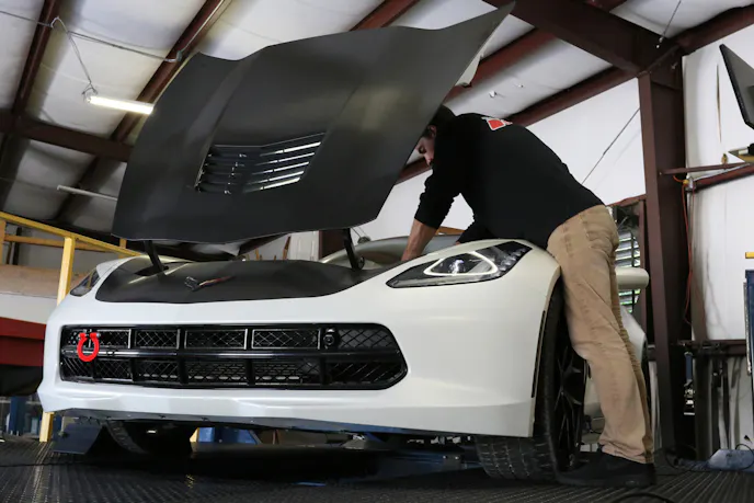 Starting with the constants, let’s explain the test environment: the test car and dyno setup. For our test car, we are using a 2016 Chevrolet Corvette Z51, 6.2L LT1 engine with direct injection, equipped with a Vortech V3 supercharger and intercooler, blower spec’d camshaft, long-tube headers and high flow exhaust. Essentially, we view this car and combination as representing the “sweet spot” in the market, and thus a good car for our tests. We identify this sweet spot as cars that are capable of low 10 second to low 12 second quarter mile times; the bread and butter of most performance shops. Most street/strip performance car owners are happy in this power range. Yes, we could have built a more powerful car to test with, but we see this car as a good and reliable representation of what most tuners and customers will be dealing wtih.