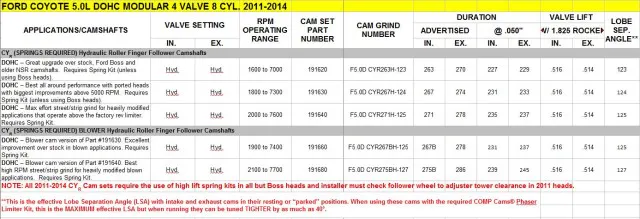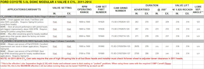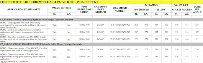 Lobe Seperation: 125 degrees“When the 5.0 Coyote first came out, all we had to go from was the OEM information we had acquired through the SEMA Technology Exchange and the older profiles we had designed for the older 4.6-liter and 5.4-liter applications,” said Billy Godbold of Comp Cams. “Because we had never physically seen the engine, tested it on the Spintron or dyno, and had never weighed or even held the new follower and valve combinations, we probably underestimated just how great of a job the Ford engineers had done when they reduced the package size, weight, and then increased the follower stiffness.”
