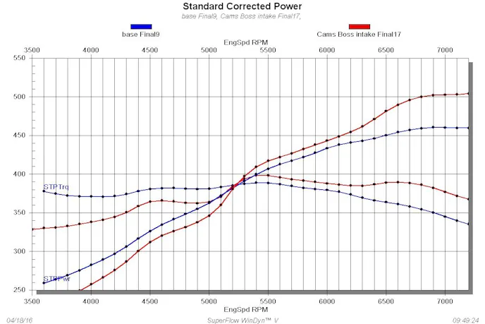 While installing camshafts in a Coyote isn’t for the faint of heart, it’s also not overly complicated. Having an engine that doesn’t need to be degreed makes installing camshaft upgrades in Coyotes fairly straight forward. In a matter of two hours we were able to pick up 50 horsepower to the crank while pushing our peak power up 700 rpm. We have to say that we are more than happy with what we achieved from our day on the dyno!