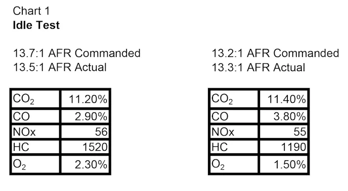 Chart 1 shows our results. We compared 13.7:1 to 13.2:1 and were surprised by the EMS machine’s report. As you can see, commanding a half-ratio richer 13.2:1 AFR resulted in a 22-percent reduction in HC combined along with a slight gain in CO2 and a positive reduction in O2. Granted, the CO2 gain was minimal—but since higher CO2 means we improved combustion efficiency—any gain is good. The AFR numbers at the end of each report are the measured AFR from the 5-gas machine, while at the top of each chart is the AFR requested from the Sniper. As you can see, they are very close.