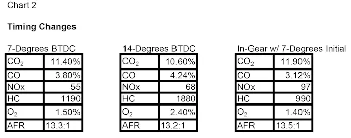 The most important result is again the change in CO2, which lost nearly a full percentage-point when we added timing. Since CO2 is the gas that indicates improved combustion efficiency, in this engine it was clear that adding additional timing did not make this engine happy. Note that when we added timing, the HC numbers nearly doubled. Again, we’re not trying to reduce emissions as much as finding where the engine is most efficient. Adding timing affected the CO even though we didn’t make any AFR changes. This reinforces that 14-degrees initial timing was too much, as the AFR equivalent of 4.2-percent CO is 12.93:1.