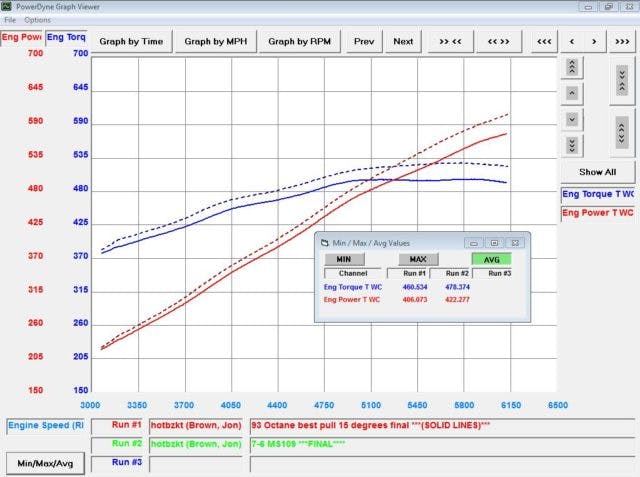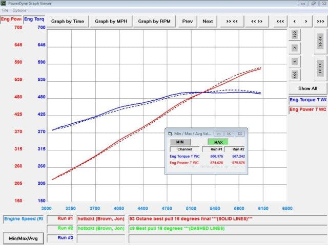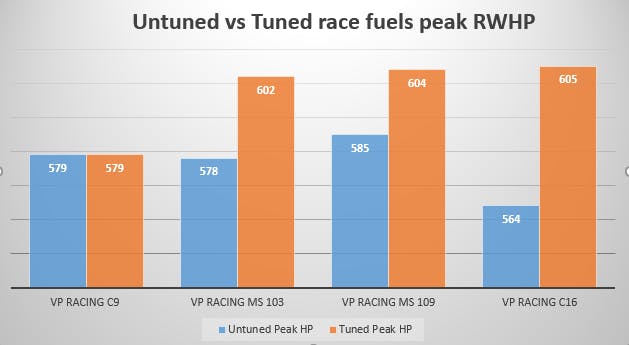 In our test group of VP Racing’s C9 vs. MS103 vs. MS109 vs. C16, C16 made the best peak and average power, making 605 rwhp, an improvement of 31 rwhp and 28 lb-ft of torque over 93 octane pump gas alone after tuning. With so much octane (120+), this fuel was also the worst at making power before being tuned, making 10 rwhp less than pump gas before we tuned it with 15 degrees of spark advance.