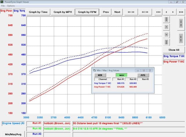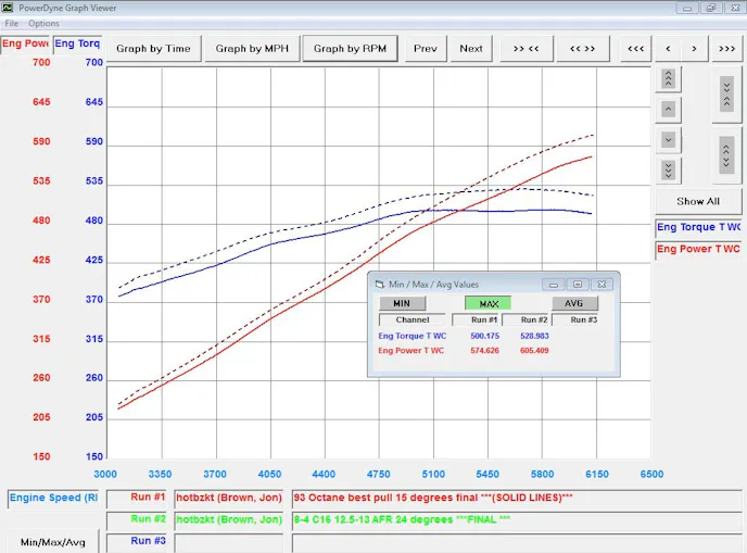 C16 is the slowest burning fuel of the bunch – but still king of the non-ethanol based race fuels. Old-school C16 fuel made 605 RWHP, just 1 more horsepower than MS109. With a very low Reid Vapor Pressure (a measure of the volatility of gasoline) it doesn’t turn into a vapor for burning easily, and required 24 degrees of spark advance, compared to 93 octane pump gas needing only 15 degrees for maximum safe power. Reid Vapor Pressure is, more specifically, an absolute measurement of how much vapor pressure is exerted by the fuel at 100 degrees Fahrenheit. ASTM-D-323 is the test if you are interested in looking it up. Below are the peak results after tuning.