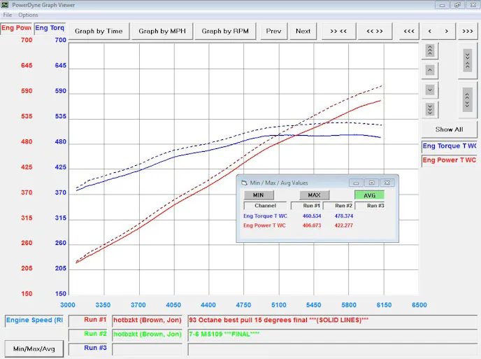 Below is the 93 octane baseline (solid lines) vs MS109 (dashed lines) AVERAGE dyno chart. It’s not what you’re used to seeing (Peak charts), but this is a better way of looking at power gains across the entire RPM range. Tuning was a breeze–these fuels needed just a few tweaks to be maximized. This included adjusting the stoichiometric point to what the VP Racing specs call for, as well as spark adjusted upward (from 15 degrees on 93 octane pump gas) to 22-23 degrees with MS103 and a preferred AFR of 11.7-11.9:1. MS109 preferred 21 degrees of advance, with a slightly leaner AFR of 12.0-12.4:1 at full throttle for maximum safe power.