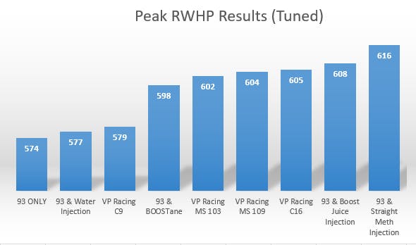 That’s right: we’re saying conclusively from our testing that some race fuels won’t make much more power than 93 octane pump gas. They know it; we know it, and now you know it. In fact, here’s a chart showing how our test group of race fuels performed before being tuned for the race fuel. Also important to note here is how much more power they made over pump gas (which produced 574 rwhp) after tuning.