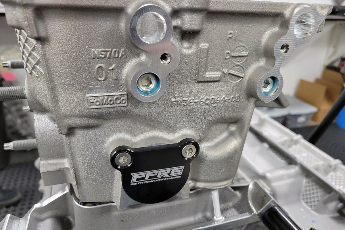 Everywhere you look on this engine, there are little touches that show FFRE’s attention to detail. One standout is the freeze plug delete system used on the back of each head. Designed to prevent coolant from leaking onto the track in case of a failure, the system bolts in place with double O-rings. If a plug does somehow get pushed out under pressure, causing a leak, it will happen inside the engine valley where it won’t cause a safety issue.