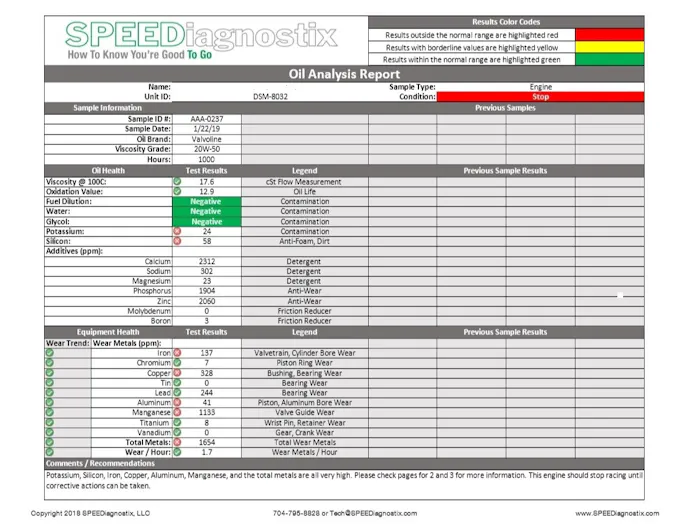 Next, a 3-ounce oil sample was taken from the engine and shipped off to SPEEDiagnostix for analysis, along with a 3-ounce sample of fresh oil reserved from the original case of oil used in this engine. The idea is to match physical findings with chemical analysis for confirmation as well as to examine chemical properties which may not be so visually obvious.