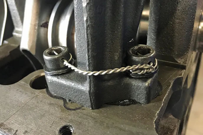 Checking rod bolt stretch during installation is standard procedure, but SWRE’s most notable assembly procedure is not — it safety wires the rod bolts. While thought of as overkill by many, the off-road racing environment constantly looks for hardware to loosen and parts to kill. For non-rotating parts, safety wiring can save a lot of headaches (and dollars) when applied correctly.