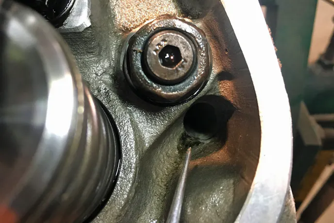 While not full of dirt/sand, there was evidence of contamination where dirt had fallen out of suspension in oil drainage passageways leading back to the crankcase. Before removing the heads, valve lash was measured on all intake and exhaust valves. Intake valves indicated 0.011 to 0.016 inch, exhaust valves indicated 0.016 to 0.020 inch. Both of those measurements fall within spec and indicate there probably wasn’t much valve cupping or valve seat damage. This hypothesis was later visually confirmed.