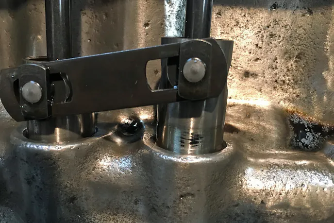 Relieving the spring pressure on the rockers allowed removal of the pushrods, which looked clean and all measured within 0.001 inch. Next, the lifters were pulled from their galleys and inspected. Unfortunately, an indication of contamination and wear showed up. Dimensionally, the lifters checked out fine, so the wear was documented and the lifters were scheduled to be polished to see if there was more life left in them or if replacements would be required.