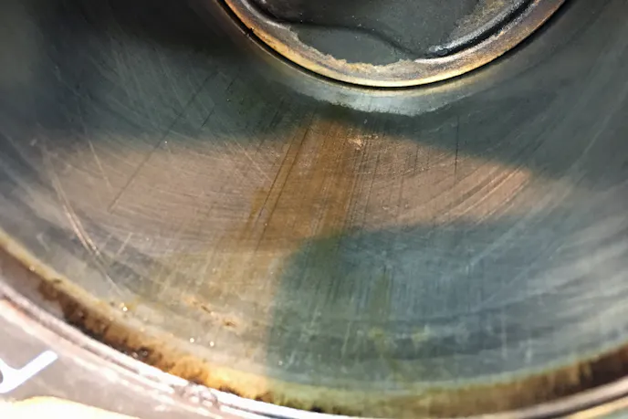While examining piston tops, it was obvious the sand seen in the air filter housing worked its way into the cylinders. The bottom face of each cylinder showed scratches running longitudinally along the cylinder wall. Scraping a fingernail across the scratches indicated more than surface marring, so the issue was documented and would be examined later during the machining processes.
