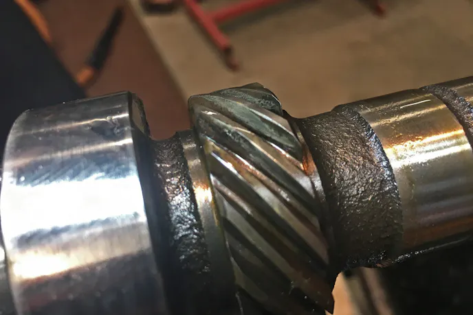 Being the epicenter of the wear and tear Baja inflicted on this engine, the camshaft received a lot of attention once removed. Most notable was the wear on the drive face of the camshaft’s drive gear teeth. While not as severe as the wear seen on both distributor drive gears, the wear on the cam gear indicated significant loading and abrasion.