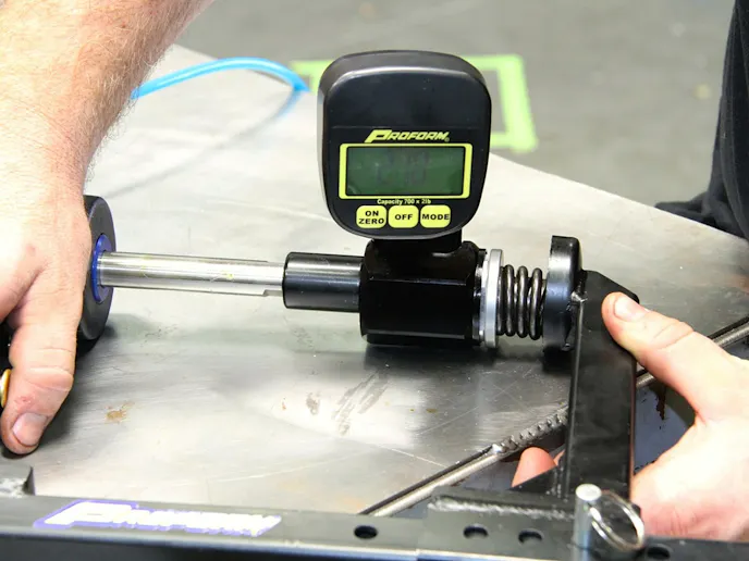 How To Use It: Proform’s mini spring tester makes it quick and easy, although the spring does have to be removed from the head in order to be checked. There are two mini spring checkers; part number 66835 has a range of 0-300 pounds and reads in 5-pound increments, while 66834 has a wider range of 0-700 with 10-pound increments. To use it, just install the tester and a spring in a vice or arbor press (or with a spring compressor as shown in the photo) and check the pressure at the spring’s installed and open heights.