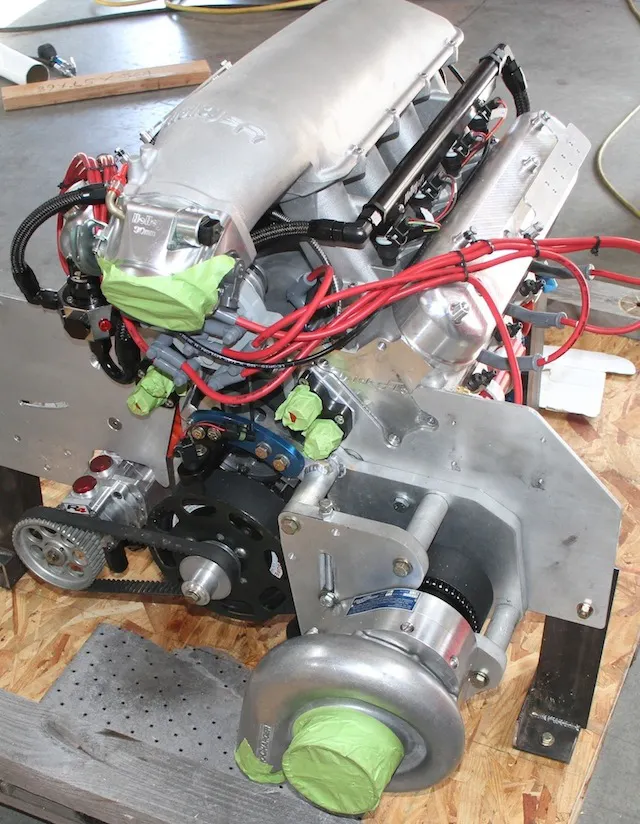 To complete the induction system, a ProCharger F-1R and Dan Schoneck-designed reverse belt drive was mounted to the engine. The F1R supercharger is spec’d to the required rules, features a self-contained oiling system and is documented to support boost levels as high as 30 psi. The interior-mounted air-to-water intercooler from Chiseled Performance is built for 2,000 horsepower.