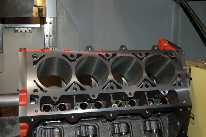 The machinist entered the bore locations, deck height and other dimensions in the CNC machine to blueprint the limits for the block. Because each block has some variations due to casting process, each set of machining limits are specific to individual engines.
