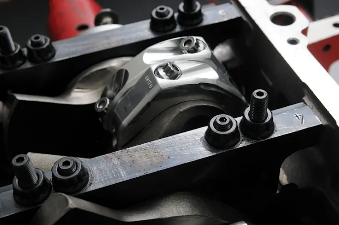 Bearing clearances are different based on the application of the engine. With street or road race engines, you’ll run clearances a lot tighter since the block gets hotter and the main bore expands and gets more and more bearing clearance as you go. A drag race motor never sees those kind of temps so you can run much looser clearance in a drag race engine. These engines are usually making more horsepower, so you have to compensate for more crankshaft flex. The problem comes in when you are setting the bearing clearances cold. If you are going to be running 250 to 260 degree oil temps, you have to account for that when measuring cold bearing clearances – you have to make room for that so they don’t beat the bearings out. On this cast-iron block drag race engine, the main bearing clearances were set at .0027-.0029-inch. ARP fasteners were chosen for consistency in grain structure. This type of quality fastener offers a better torque and more uniform torque between fasteners.