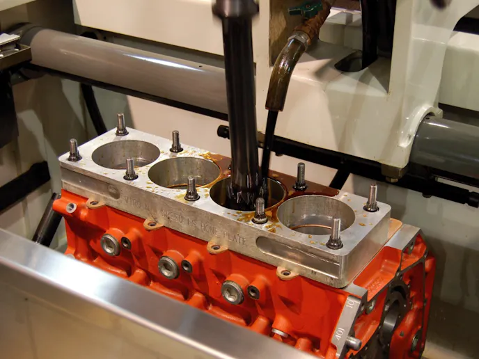 The block made a pass through an ultrasonic clean-up tank in preparation for honing. Like most machine shops, Virginia Speed uses a torque plate when performing the cylinder honing; however, there are other considerations taken into account. The main bearing caps were put back on and torqued to specifications, and the torque plate was bolted on with the same type fasteners that will be used in the installation. These steps help simulate the same tension that the block will be exposed to when the cylinder head is installed. Ambient air temperature can also affect the honing process by tolerance changes.