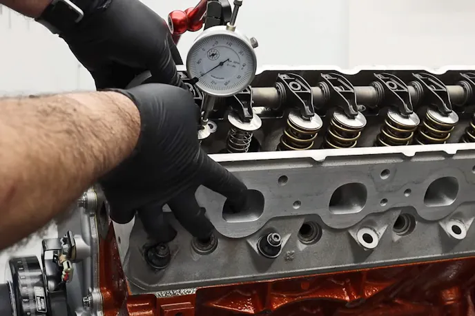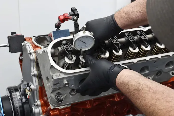 The minimum clearance we’re looking for in a combination like LS5.0 is .080 inch. The dial indicator shows that we have .120 inch of clearance. Since that measurement is without a head gasket in place, we know we can add another .040 inch to that number, and since we’ll likely be retarding cam timing on the dyno, our intake valve clearance will only increase.