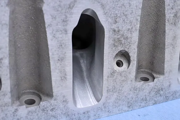 The chambers are treated to the same CNC treatment, profiling and contouring the factory shape into something better performing. The valve seats are then given a three-angle valve job to fit the upgraded valves. The target for their standard program is a 65cc chamber, but since we are shooting for 11.3:1 compression, we had them deck the head down to a 60cc chamber volume.