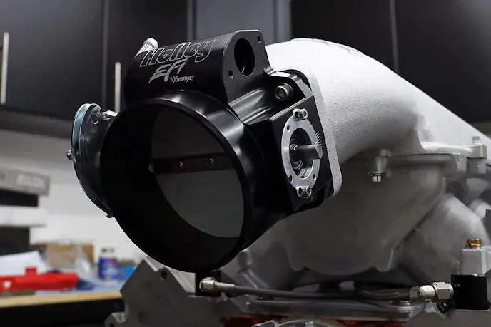 Since the largest throttle body that will fit on the forward-facing lid is 105mm, that’s the throttle body we chose for LS5.0. Specifically, the Holley EFI billet 105mm throttle body with the straight bore (PN: 112-583). The straight bore variant will provide the absolute maximum airflow to the engine, while a host of other features — like a clockable TPS mount, idle bleed adjusters, and an adjustable PCV passage — add to the functionality and drivability of the engine.