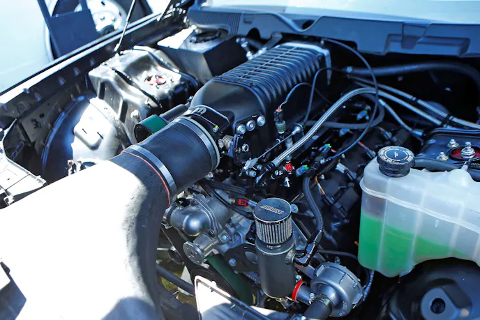 A class-spec 2.9-liter Whipple twin-screw supercharger provides the compressed atmosphere, while a Holley EFI system controls the fuel and spark portions of the equation.