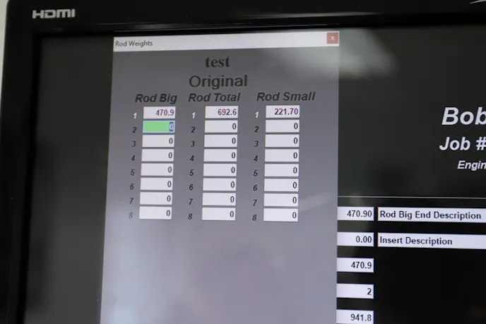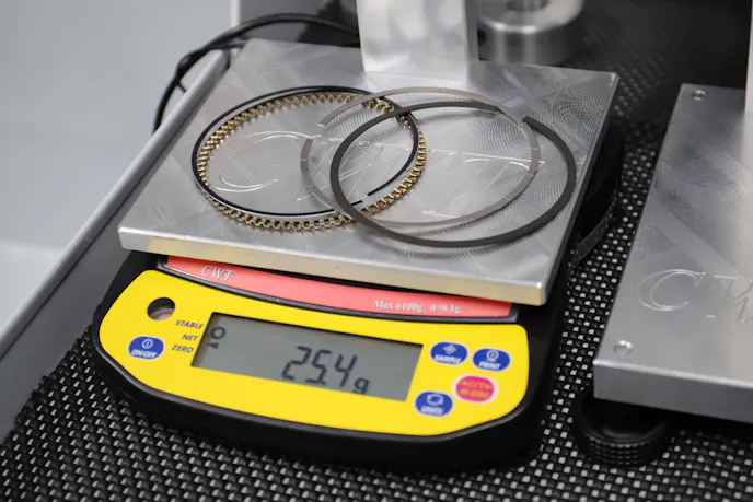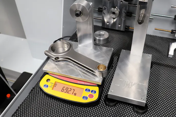 We explain that, to explain the process of creating bobweights for the balancing process. We don’t actually hang a piston and rod off the journal while spin balancing the assembly. But rather, a precisely weighted bobweight, which is clamped to the journal. By using precision scales to measure the weight of every component being used in the rotating assembly, bobweights are built to match those weights.