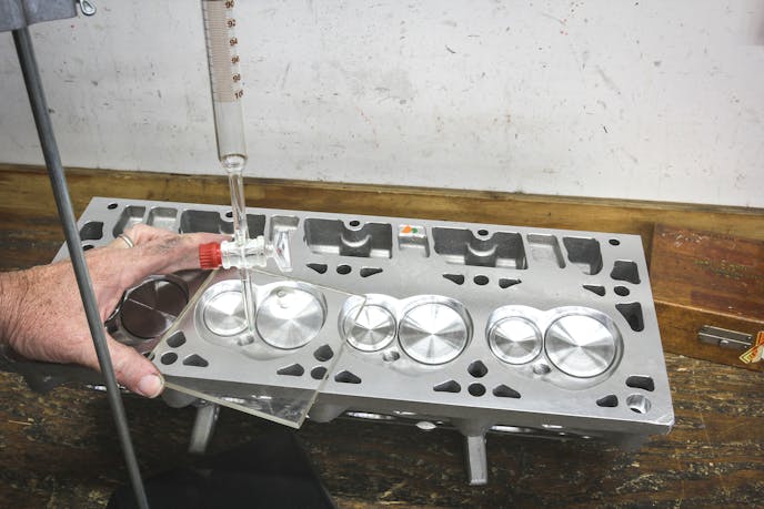 In order to calculate actual compression ratio, you will need to know the specific chamber volume, which means you will need a burette. There are less expensive versions, but for best accuracy, a glass burette with a heavy metal stand is the way to go. This can also be used to measure actual piston top volume in the engine. We’ll show how to do that in an upcoming article of the Blueprint Series.