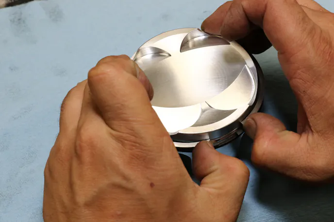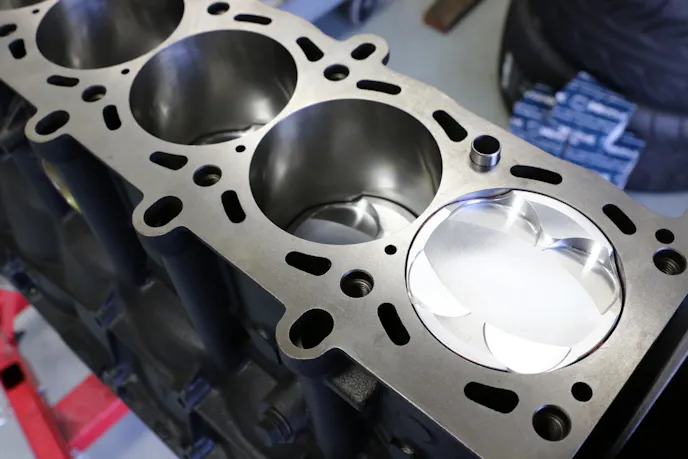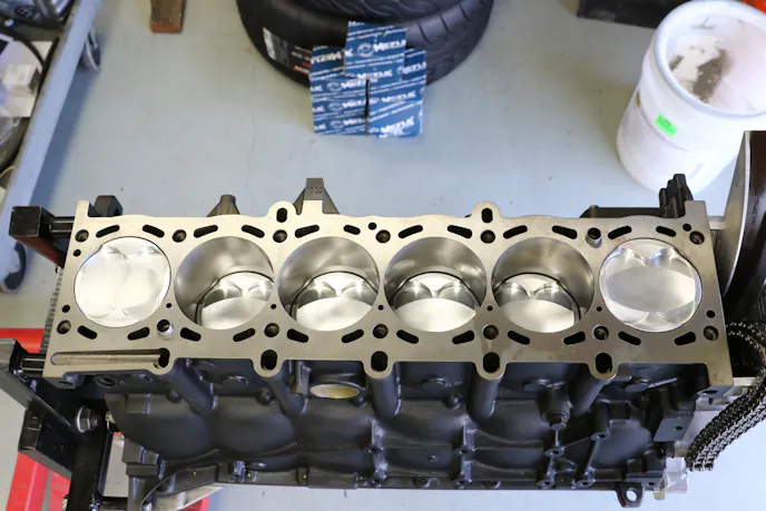 Connected to the Carrillo rods are a set of JE Pistons 297117 stock compression ratio pistons. Since we are running our E46 on only 9 psi of boost, we wanted to minimize the torque loss from a lower compression ratio piston. The FSR (forged side relief) asymmetrical forging keeps the skirt panel width where it needs to be (wider on the thrust side of the bore) to minimize weight and friction. The pistons’ friction is further reduced with an included 1.0 mm/1.2 mm/2.8 mm ring package. Even though these pistons are stock in compression, the 2618 alloy pistons can handle over 1,000 horsepower if we ever wanted to push it that far.
