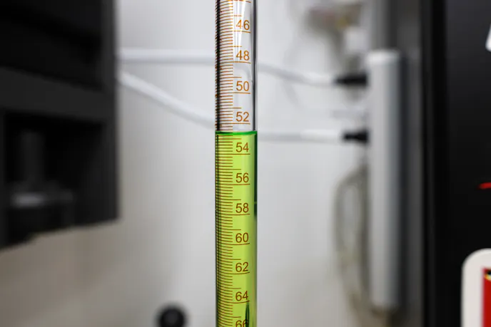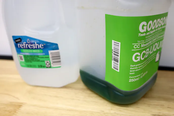 From there, you need to fill the burette with your measuring fluid. Goodson offers an easy solution to that, in their CC Measuring Liquid Concentrate (P/N: GCB-LIQUID). It comes in a one-gallon bottle that is barely filled, so as to save weight and the associated shipping costs. You simply add in some distilled water, shake it up, and you have a high-visibility neon green fluid that makes you feel a little like a mad scientist.