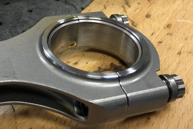 The connecting rods are – like most parts in a rotating assembly of this caliber – custom pieces from Dyer’s Top Rods. Made from 300M steel, the H-beam units are Honda-sized on one end, and sized to fit the custom wrist pin on the other. Even the rod bolts are super-trick, using pieces made from Carpenter Custom Age 625-Plus steel, as opposed to ARP2000 or even L19 (we feel the need to warn you to be sitting down when you look up the price of Custom Age 625-Plus rod bolts).