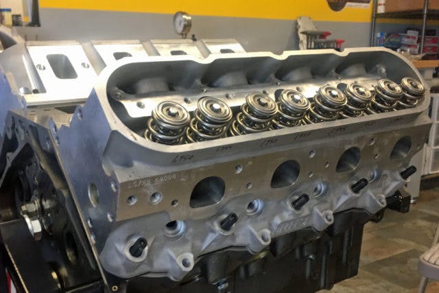 As Strader mentioned, this particular engine is a ground-up LS build, featuring exactly zero stock components. For a solid base, Strader chose a Dart SHP LS Next engine block. It features thicker cylinder walls and deck, a priority main oiling system, extended cylinder barrels, and splayed outer bolts on the middle main bearing caps. Strader took the factory 4.125-inch bore version, and opened it up another fifty-thousandths, to 4.185 inches.