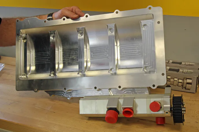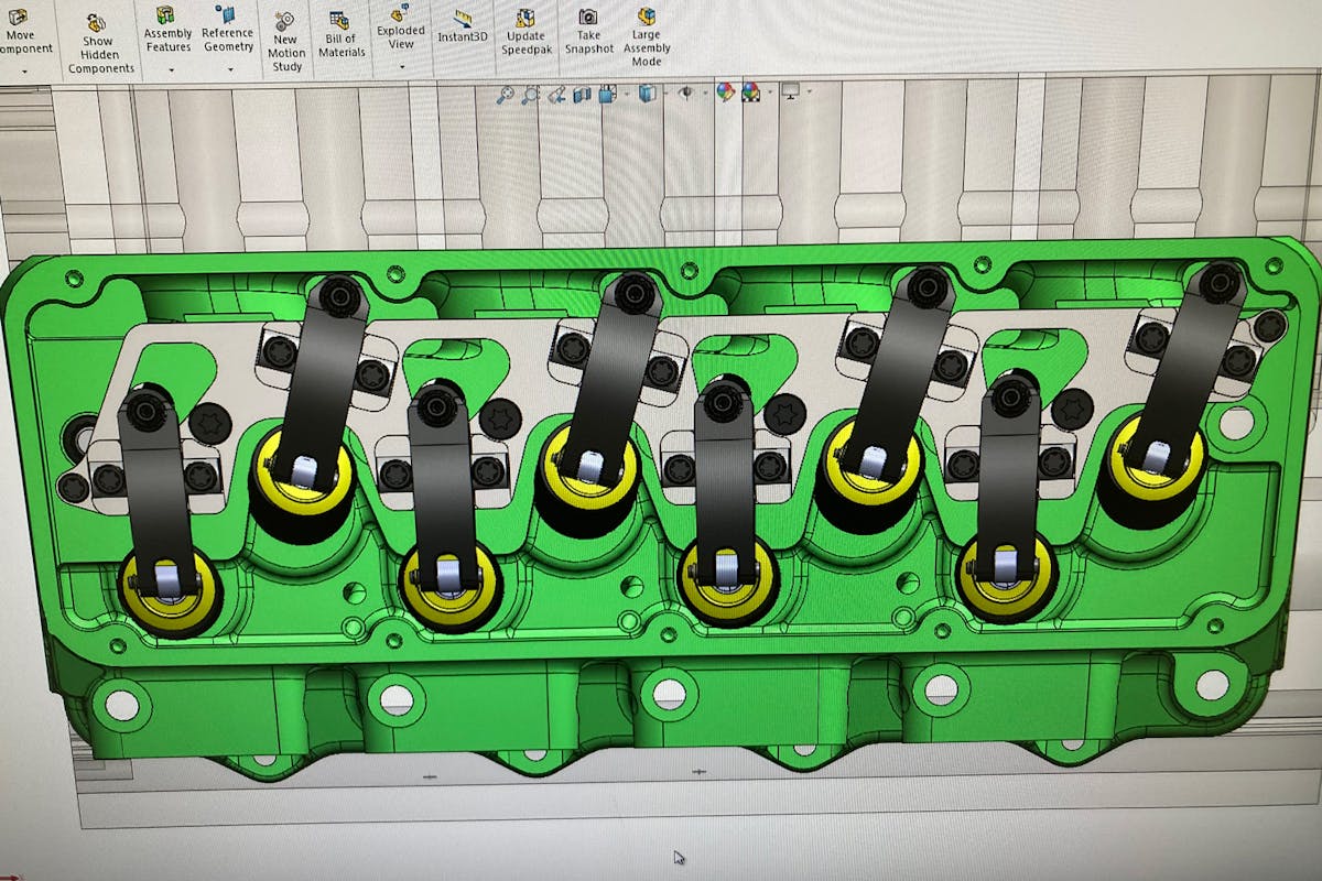 The design of the valvetrain is different than before, with the reverse order of the valves. “Jesel has 3D-printed some rocker arms and shafts for us,” Strader says.”We ended up cutting them up, epoxying them back together, and sending them back, and they are currently redesigning the rockers. The camshaft layout will be different as well. We had to reverse the lobe layout on the shaft, so Jesel is creating a new 63mm clamshell-bearing cam for us.”