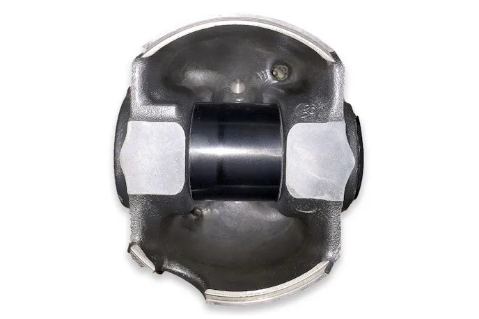 Steel pistons have oil cooling galleries in the top of the piston to draw heat off the rings. Oil is sprayed onto the bottom of the pistons and directed to these cooling galleries to remove heat. Cooling galleries typically reduce the top ring temperature by up to 100°F, which leads to better sealing and longer ring life. Heavy-duty, high-output commercial and truck engines often use two-piece “articulated” steel pistons with steel crowns and aluminum skirts or one-piece weldment pistons. Articulated pistons are two-piece pistons held together by the wrist pin. They allow the piston to handle higher loads than one-piece cast pistons and typically carry a very hefty wrist pin to mate the articulating crown and skirt components. One-piece steel pistons also offer advantages over one-piece cast aluminum and forged aluminum pistons and two-piece aluminum/steel pistons.