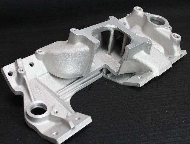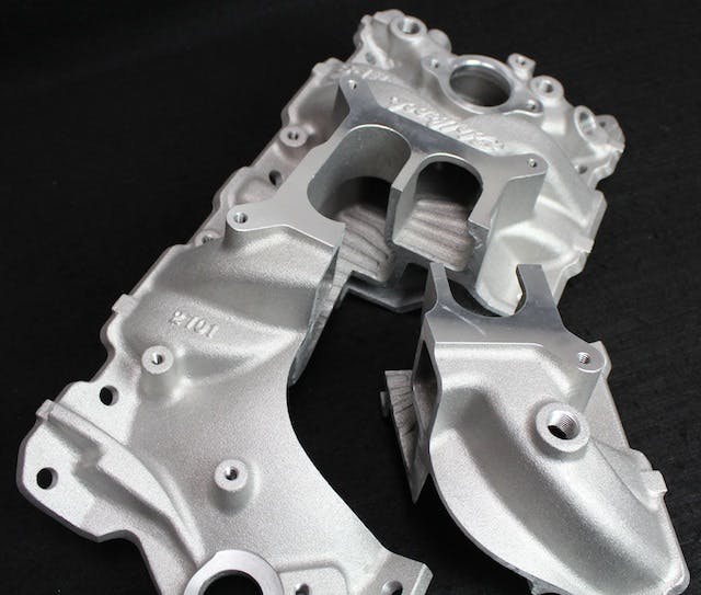 “On some of our dual-plane manifolds, we will cut down the center divider; it varies from one manifold design to another,” explains Smith. “The amount that the divider is cut down isn’t determined by numbers on a dart board. This is all based on dyno testing and flow testing by our engineers. What this does is help balance the air signal to the carburetor for the air/fuel mixture at higher rpm. This technology goes back as far as Vic Edelbrock, Sr, and the old slingshot manifolds on flatheads.”