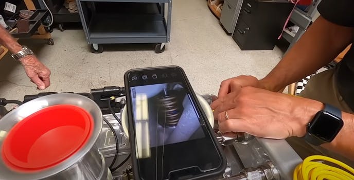 Up top, custom-milled replacement rings for the cam sensor pop into the opening where the fuel pump used to be, and are mounted with non-magnetized bolts to eliminate the risk of interference when timing that offset to 45 degrees. As for ignition timing, Pink says that is dialed in at 10 degrees, whereas the other bank comes pre-set at 45 degrees, even though you can adjust it anywhere between 30 to 50 degrees as needed.