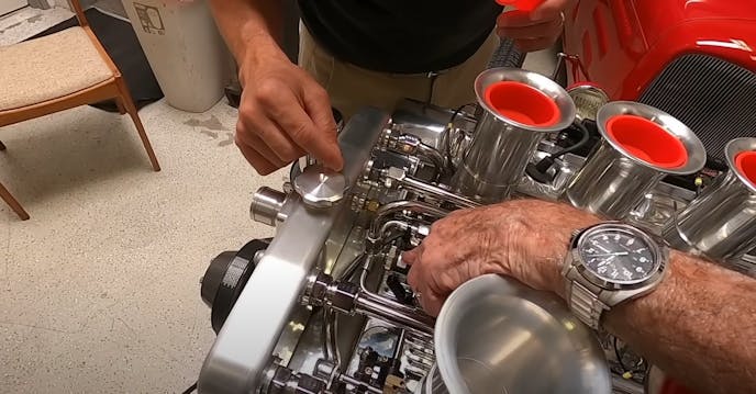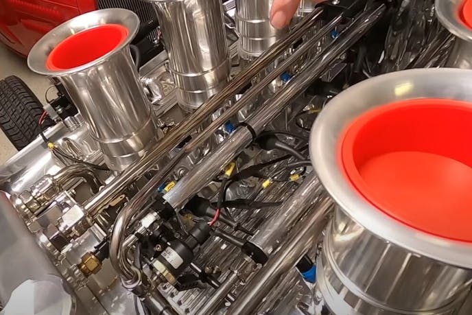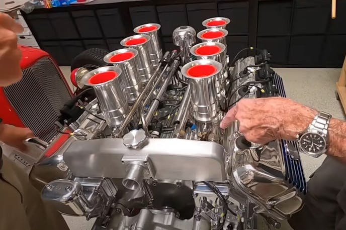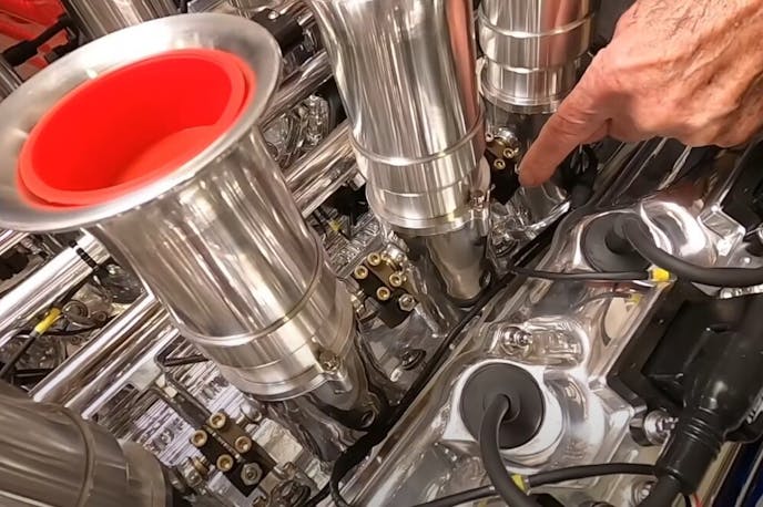 On this particular motor, a Hillborn mechanical fueling system ties into a Kinsler manifold setup up top, which is machined to match up with the EFI side of the 427 Cammer V8. With custom adjustable butterflies on each stack making for easy adjustability and a smooth idle, Pink says a little help from some exhaust temp measurements can easily get you dialed in idle-wise.