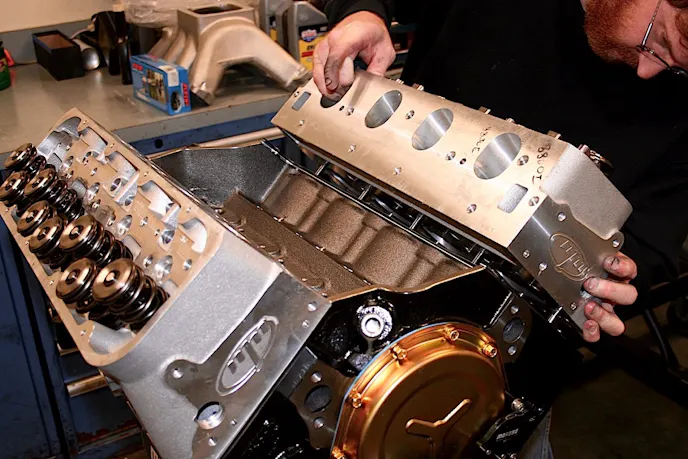 Shafiroff called on M&M Competition Engines to develop a cylinder head/cast intake manifold package. Although the valves are steel, Shafiroff called for a 5/16-inch stem to help reduce the weight while still being cost effective. Rocker arms are from Jesel. Since the SB2 head was designed as a single 4-barrel engine to compete in NASCAR, Shafiroff retained that arrangement.