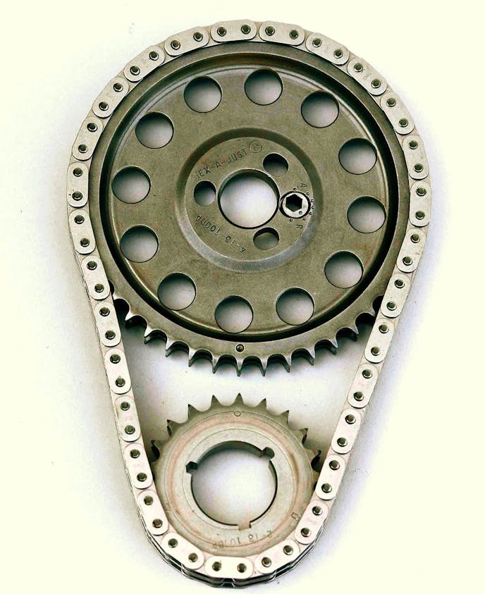 If you’re staying with a chain drive (which is still good, millions of small-block Chevys came that way), in a performance application, especially one using stiff valve springs, it should at least be upgraded to a double roller chain and gears for more strength, but the truly hot setup is a Cloyes Hex-A-Just true roller timing set.