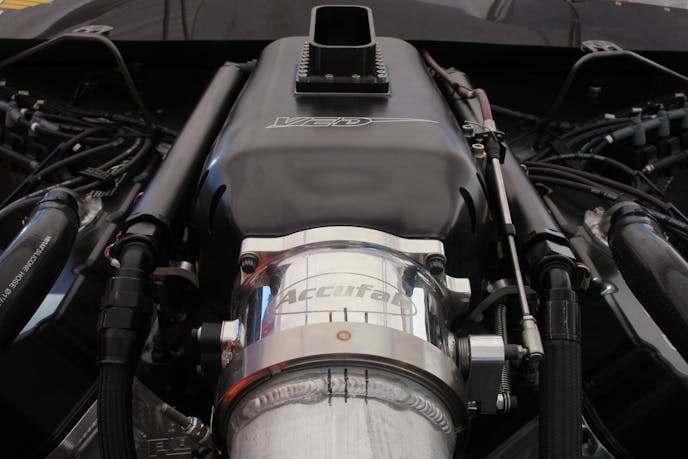 Although we are unwilling to disclose the exact gear ratio provided by the Winters Performance gears inside the drive, we will say that the supercharger is spinning somewhere around 68,000 rpm to make about 50 psi of boost pressure. Although the CDS gear drive is capable of driving many external accessories such as a vacuum pump, water pump, power steering pump, and more, we’re simply using it to drive our Aeromotive Spur Gear fuel pump, designed specifically for Pro Mod and Nostalgia Funny Car-style applications, where fuel demands are robust.