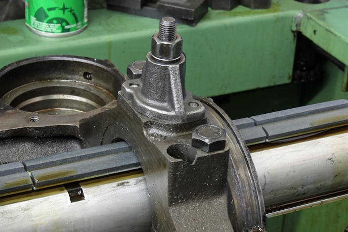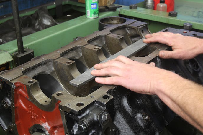 Peart says new aftermarket caps can be as much as 0.050- to 0.060-inch undersize. This requires several 0.010- to 0.020-inch cuts individually on each of the three new caps in the block. Once the caps are cut to within 0.003 inch of their final size, the bores are then honed to the finished size.