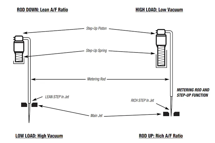 The primary metering system is designed with a tapered metering rod attached to a power piston, which is supported by a calibrated spring. Under light-load conditions (which is roughly 80- to 90-percent of carburetor operation), engine vacuum compresses the spring and places the larger portion of the tapered metering rod in the jet. This reduces the jet’s flow area, allowing the engine to run at a leaner air-fuel ratio.