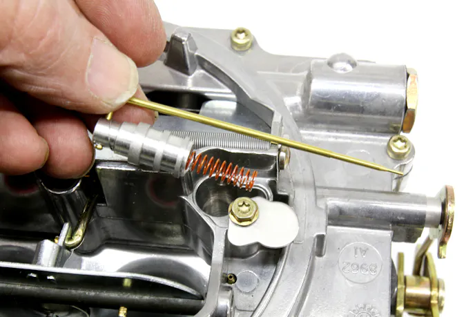 What makes the Edelbrock AVS2 line of carburetors so handy is that this metering rod, piston, and spring assembly is easily accessed with a simple loosening of a screw and removal of a small cover plate. There’s no need to remove the entire lid from the carburetor unless you choose to change the primary or secondary jets.