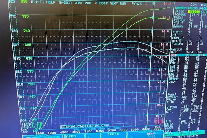 Keeter started of safely, pulling a significant amount of timing and only making short pulls. It was clear quick, fast, and in a hurry that the engine was more than happy with the mixed fuel, so RPM was brought back up to match the 7,000rpm limit of the E85 pulls, and timing was slowly reintroduced. Keeter was running his normal procedure for tuning an engine, not referencing the previous results, and by the stopping point we had some interesting information.