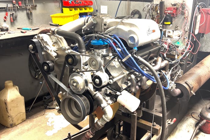 First, let’s recap the details of the E85 pulls, since they happened first, chronologically. The Retro 5.0 engine is a 302 cubic-inch small-block Ford, running forged 2618 flat-top pistons, with a stock crankshaft in a stock ’93 Thunderbird engine block. A Trick Flow Twisted Wedge 11R170 Top End Kit (TFS1 cam, 170cc 11R heads, aluminum 1.6 roller rockers) caps off the short-block, with a Holley SysteMax II intake manifold. All of that runs through a set of JBA 1-5/8-inch-primary, unequal-length shorty headers. A Holley Terminator X controls the combination.