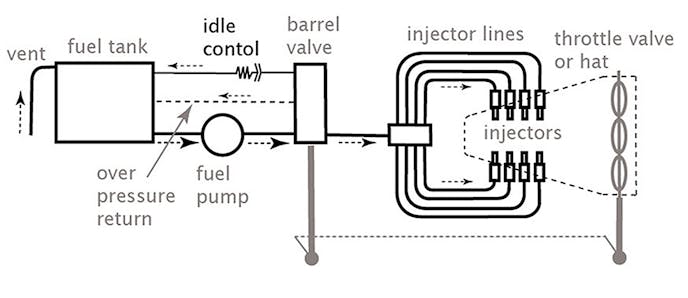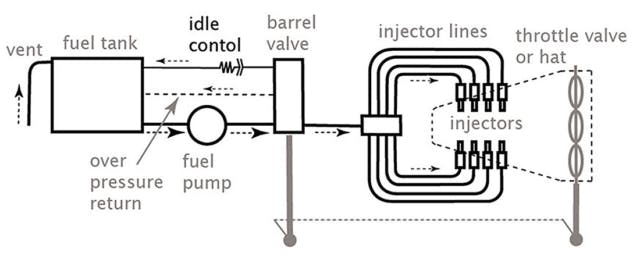 Mechanical fuel injection works with a simple throttle-controlled air valve and a fuel pump, usually running at one-half engine speed. After pulling fuel from a vented fuel tank, the fuel is delivered through a barrel valve that controls the amount of fuel with the position of the air valve. Fuel goes through the barrel valve, then through fuel lines, directly to the intake system feeding each cylinder. For tuning, simple jetting changes control how much fuel enters each cylinder. On normally-aspirated engines, a properly set up mechanical fuel injection system provides instant throttle response, which makes the system great for racing applications.